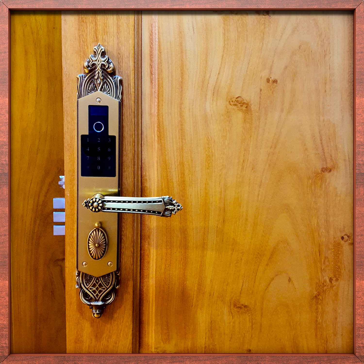 Đầu tiên là tay nắm sảnh có họa tiết hoa sen.
