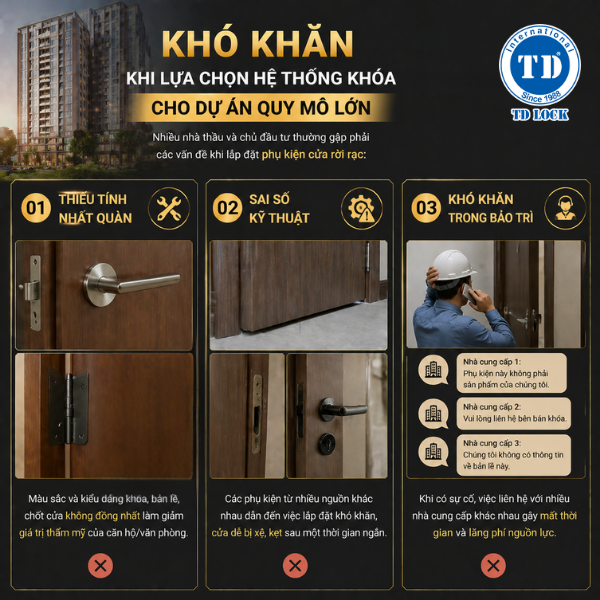Một hệ thống khóa cửa tốt là nền tảng cho sự an tâm và chuyên nghiệp của một dự án. Với bề dày kinh nghiệm gần 4 thập kỷ, Khóa Cửa TD tự hào mang đến giải pháp đồng bộ, bền bỉ và đẳng cấp, góp phần tạo nên giá trị vững bền cho các công trình chung cư và văn phòng tại Việt Nam.